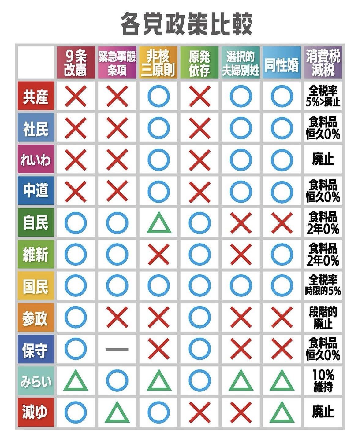 今回の衆議院選挙各党の政策比較です。